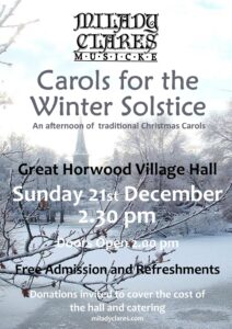 See information attached regarding a free concert by Milady Clare’s Musicke, to be held at Great Horwood Village Hall on the 21st December. Starts at 2.30 p.m. and admission is free.
